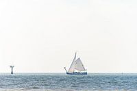 De blauwe zee met een enkele witte zeeboot, een minimalistisch landschap in de kleurtonen wit en blauw. Deze schip vaart op de Waddenzee nabij Ameland, maar het zou natuurlijk ook een ander water kunnen zijn.