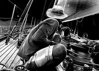 Deze foto is gemaakt tijdens een zeiltocht op de Middellandse Zee bij Turkije. In beeld is een man die het grootzeil bedient. De foto is in Photoshop bewerkt met een filter om het getoonde zwartwit effect te krijgen