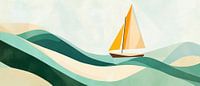 Een zachte wind waait over glooiende heuvels die glinsteren in kalmerende groene en beige tinten. Een jonge zeeman glijdt vredig over de golven, zijn gele zeil glanst in het rustige landschap. Deze harmonieuze compositie brengt een frisse, maritieme sfeer in de woonkamer en nodigt uit tot dromen en ontspannen.
