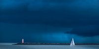 Ook al nadert er een fikse regenbui, deze zeilboot is er niet bang voor. Aan het einde van de pier staat nog een kleine vuurtoren. Daarna verlaat de boot de haven en bevindt zich op open zee.
