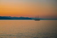 Een sfeervolle zonsopgang toont de Ligurische kust met dit prachtige zeilschip met drie masten en de warme, weerspiegelende zee.