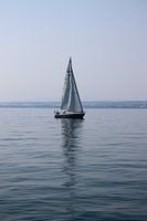 Een eenzame zeilboot op de grote Bodensee, geschoten vanaf Meersburg. Dankzij het rustige water is de weerspiegeling van de boot nog steeds goed zichtbaar