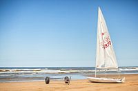 Een Laser zeilboot ligt aan de vloedlijn van de Noordzee bij het strand bij Katwijk aan Zee. Naast de boot staat een bootkar. Deze foto is gemaakt op een zonnige dag in de Zomer van 2013