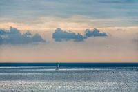 Zeilbootje op de oceaan aan de rand van Lanzarote, Canarische Eilanden, in het vroege morgenlicht met lichtvlekken van de ochtendzon.