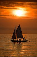 Met de kleur van de ondergaande zon die alles in het oranjerood zet vaart een klein zeilbootje over het IJsselmeer nabij Stavoren op een fraaie zomeravond.