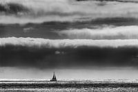 Zeilbootje aan de horizon met en horizontal lijnende bewolking