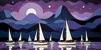 Kleine witte zeilbootjes 's nachts bij maanlicht op een purperen bergmeer in een abstracte psychedelische stijl. Gegenereerd met behulp van AI.