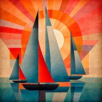 Een abstract, digitaal en vooral kleurrijk werk met een aantal zeilboten.