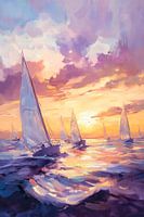 Zachte golven en witte zeilen dansen in het gouden licht van de schemering. De paarsoranje lucht wordt weerspiegeld in het kalme water en creëert een sfeer van vrijheid en ontspanning. Dit betoverende zeegezicht is perfect voor de woonkamer, waar het de ziel kalmeert en een vakantiestemming verspreidt.