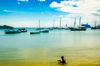 Jongen op het strand en zeilboten in de baai bij Buzios aan de Costa do sol in Brazilië