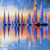 In deze foto versmelt een maritiem motief met de esthetiek van digitale structuren. Het getoonde werk ensceneert zeilboten als silhouetten tegen een kleurrijke lucht, terwijl de bovenste en onderste delen van de foto doordrongen zijn van pixelarchitectuur en de compositie breken. Deze digitale fragmentatie creëert een spanning tussen natuurlijke harmonie en technische abstractie en opent een dialoog tussen vloeiende beweging en geometrische orde.