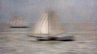 'De Kuiper Brandaris Zeilrace van Harlingen naar Terschelling.' Te zien zijn klassieke platbodemschepen zoals, klippers, aken, tjalken, botters, skutjes. Dit is het grootste zeilevenement van de Nederlandse bruine vloot. Door de nabewerking wordt het een wat mysterieuze aanblik