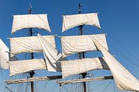Driemaster bark Artemis klassiek zeilschip uit Nederland zeilt over de Waddenzee de haven van Harlingen binnen tijdens de finish van de 2018 Tall Ship Race op 3 augustus 2018.