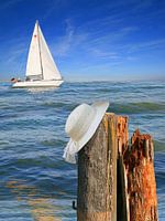 Zeilboot op de zee en op de voorgrond de vergeten hoed.