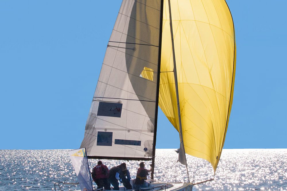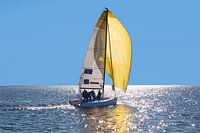 wedstrijd zeilboot op het water tegen de zon in.