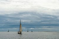 Zeilend in de richting van het dreigende wolkendek. In de verte lonkt de haven op een van de Waddeneilanden.