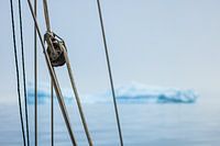 Een sfeervolle detailfoto van tuigage, een blok en verstaging van een zeilschip tussen de ijsbergen in de Disko Bay (Diskobaai) van Groenland.