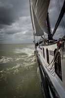Oude zeilboot vaart over het IJselmeer met stevige wind.