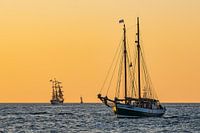 Zeilschepen bij zonsondergang op de Hanse Sail in Rostock. van Rico Ködder