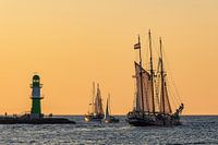 Zeilschepen in de zonsondergang bij de Hanse Sail in Rostock.