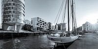 Zwart-wit foto van het historische zeilschip ELBE in Sandtorhafen en de Elbphilharmonie Concertzaal in HafenCity, Haven van Hamburg, Hamburg, Duitsland.