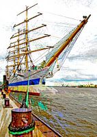 Russisch zeilschip Mir am Kai in Hamburg ter gelegenheid van de verjaardag van de haven, Duitsland.