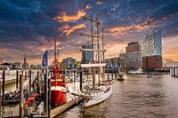 Zeilschip en lichtschip in de Elbe-haven van Hamburg in Duitsland met wolken en Elbe Philharmonic Hall
