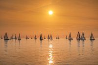 Een zeilwedstrijd op het IJsselmeer nabij Stavoren tijdens zonsondergang. Door de afwezigheid van wind was het water een spiegelend oppervlak en lagen de zeilbootjes vlak bij elkaar wat het beeld een welhaast surrealistisch tintje gaf.