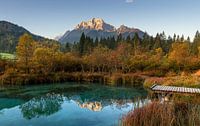 Het mooie, kleine Zelenci Meer ligt in het dal van de Sava rivier, in het Zelenci natuurreservaat in de Julische Alpen, in noordwest Slovenië. De foto is in de vroege ochtend bij zonsopkomst gemaakt.