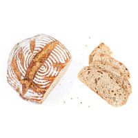 Zelfgebakken zuurdesembrood tegen lichte achtergrond, van bovenaf gefotografeerd.