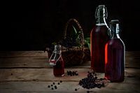 Zelfgemaakt sap van zwarte vlierbessen (Sambucus nigra) in flessen en bessen in een mandje op rustieke houten planken tegen een donkere achtergrond met kopieerruimte, traditionele drank tegen verkoudheid, geselecteerde focus