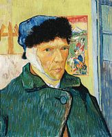 Zelfportret met ingezwachteld oor, Vincent van Gogh (1889) Van Gogh schilderde dit in januari 1889, een week nadat hij het ziekenhuis had verlaten. Hij was daar behandeld nadat hij het grootste deel van zijn linkeroor had afgesneden (hier afgebeeld als het ingezwachtelde rechteroor omdat hij zichzelf in een spiegel schilderde). Deze zelfverminking was een wanhoopsdaad die een paar weken eerder was begaan na een verhitte ruzie met zijn collega-schilder Paul Gauguin. Van Gogh's bontmuts beveiligt zijn dikke verband en houdt de winterkou tegen. Dit zelfportret, gemaakt onder barre omstandigheden, toont Van Goghs vastberadenheid om door te gaan met schilderen, versterkt door de voorwerpen achter hem: een doek op een ezel en een Japanse prent, een belangrijke inspiratiebron. Het zijn vooral Van Gogh's penseelvoering en krachtige kleurgebruik die zijn hernieuwde ambitie als schilder kenbaar maken.