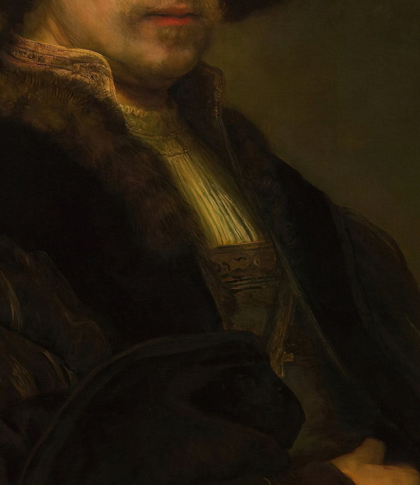 Rembrandts gebruik van belichtingstechniek, bekend als clair-obscur, speelt een cruciale rol in dit werk, waarbij het samenspel van licht en schaduw diepte en textuur toevoegt aan het portret. Het contrast tussen lichtere en donkerdere delen benadrukt Rembrandts karakteristieke gelaatstrekken en roept tegelijkertijd een gevoel van drama en mysterie op.
