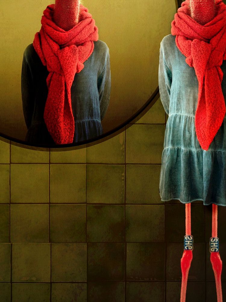 Het beeld is een montage in photoshop van meerdere foto's, een kop en nek van een struisvogel, de benen van een flamingo ,favoriete kledingstukken van mijzelf, een woestijnratje, tegels uit een badkamer en de spiegel heb ik zelf getekend.