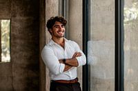 Met een stralende glimlach en zelfverzekerde houding straalt de persoon op deze foto levensvreugde en optimisme uit. Het samenspel van het warme licht en de minimalistische architectuur creëert een uitnodigende sfeer. Ideaal voor de woonkamer om positieve energie en inspiratie te bevorderen.
