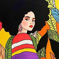 krachtig vrouwelijk portret waarin kleur en patroon centraal staan. De vrouw heeft een zelfverzekerde blik en is weergegeven tegen een achtergrond van weelderige bladeren en kleurrijke vlakken. Haar volumineuze, zwarte haar omlijst haar gezicht en contrasteert sterk met de levendige kleuren van haar kleding en de omgeving. De…