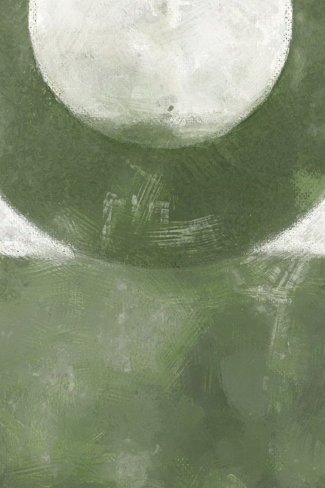 Dit werk toont een harmonieuze compositie van een cirkelvorm die als het ware zweeft boven een verdeelde horizon. De vorm suggereert balans, meditatie en cyclische energie. De textuur is korrelig en zacht geborsteld, met subtiele penseelstreken die het oppervlak een ambachtelijke gelaagdheid geven. De verf is aangebracht in dunne, doorzichtige lagen, waardoor een organisch en ademend geheel ontstaat.