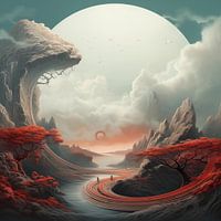 De lijnen in hun grillige finesse onthullen de ziel van een rotsachtig landschap, waar de stilte spreekt en het evenwicht heerst. Zij dansen met een bedachtzame gratie, als een meditatieve mantra die het doek doordringt. Het licht speelt een delicate rol, als een subtiele hand die de nuances van het beeld onthult. Het schildert zachte schaduwen op het canvas, waardoor de elementen van de tuin tot leven komen als oude vrienden die hun verhalen fluisteren. De Japanse invloeden, als een zucht van kersenbloesems in de lentewind, omhelzen de compositie met een diepe eerbied voor de natuurlijke harmonie. Alles in dit kunstwerk weeft samen tot een levendig geheel, waar de grenzen tussen droom en werkelijkheid vervagen, en de ziel rust vindt in de rusteloosheid van het universum.