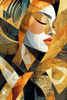 Zen Goud - Dit abstracte vrouwenschilderij combineert harmonieuze beige en goudtinten met geometrische elementen, uitstralend een serene en zen-achtige kalmte.