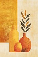 Zen Kunst | Beige Rust - Dit moderne Zen schilderij beeldt een serene compositie uit van stilistische objecten, waaronder een bolvormig object, flessen, en gebladerte in rustgevende beige en oranje tinten, op een gestructureerde beige achtergrond, allemaal bijdragend aan een gevoel van kalmte en eenvoud.