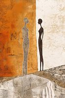 Zen Kunst | Rustgevende Mensfiguren - Dit abstracte schilderij toont twee gestileerde, ranke mensfiguren, de één transparant zilver en de ander in een effen donkere silhouet, tegen een rustgevende achtergrond van beige en een diepe oranje tint, wat een serene en meditatieve sfeer oproept.