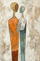 Zen Kunst | Serene Beige Kunst - Dit moderne kunst schilderij toont twee gestileerde figuren in subtiele beige en rustgevende tonen, waarbij een samenspel van oranje en teal blauw de figuren een serene maar expressieve uitstraling geeft, omgeven door een textuurrijk beige achtergrond die een gevoel van kalmte en eenvoud uitstraalt.