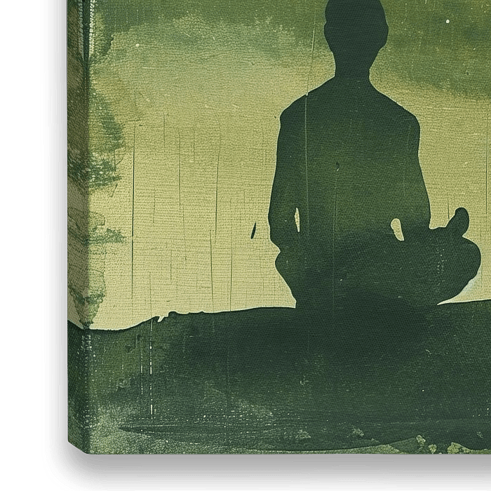 Zen Schilderij | Innerlijke Rust - In dit rustgevende kunstwerk zie je een gestileerde weergave van een mediterend figuur, zittend tegen een achtergrond van zachte, aardetinten die overvloeien in bergsilhouetten. De stilistische benadering en het subtiele kleurgebruik roepen een gevoel van sereniteit op, perfect passend binnen een…