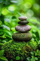 In de zachte omarming van een Zen-tuin rust een evenwichtige stenen toren op een bed van weelderig mos. De harmonieuze opstelling van de stenen, elk met hun eigen unieke textuur, creëert een gevoel van stabiliteit en evenwicht. Omgeven door levendig groen en delicaat gebladerte straalt dit tafereel rust en natuurlijke schoonheid uit. De subtiele balans van de stenen weerspiegelt de filosofische diepgang van zenpraktijken die de balans tussen mens en natuur vieren. Dit kunstwerk nodigt de kijker uit om de eenvoud en stilte van de natuur te waarderen en te blijven hangen in het moment.