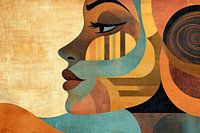 Details: vrouwenportret, moderne kunst, abstract, zen, schilderij, beige, bruintinten, oranje, blauw, gestileerd