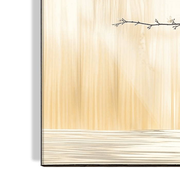 Dit schilderachtige stilleven vangt de essentie van de lente in een serene compositie. Een robuuste keramieke vaas, warm van tint, herbergt sierlijke takken vol delicate witte bloesems. De achtergrond, een subtiel samenspel van zachtgoud en zeegroen, creëert een etherische sfeer die de frisheid van het seizoen benadrukt. Het kunstwerk balanceert meesterlijk tussen realisme en abstractie, waarbij de penseelstreken zichtbaar blijven om textuur en diepte toe te voegen. Deze minimalistische benadering, geïnspireerd door Oosterse esthetiek, nodigt de kijker uit tot contemplatie en celebreert de stille schoonheid van de natuur in transitie.