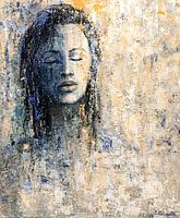 De kleuren en de ruwe structuur sublimeren met brio dit tijdloos en hedendaagse kunst. Dit schilderij op canvas is gemaakt met mixed-media, schildermes en penselen. De emoties en de ontspanning van de jonge vrouw is goed voelbaar.