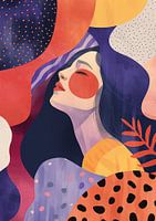 Portret van een vrouw met donkerblauw haar en rode wangen op een kleurrijke organische achtergrond van abstracte vormen. In de vormen zijn stippen van verschillende kleuren en grootte. Ook is een blad te zien. Kleurstelling is blauw, oranje, geel, rood, zwart en wit. Passend bij diverse stijlen en trends. De afbeelding geeft een zomers gevoel en een gevoel van sereniteit. Zen. Artist: Bianca ter Riet.