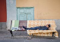 Een man die een middagdutje doet op een bankje op straat