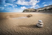 Een prachtige ochtend aan de Franse kust. Op het verlaten strand is er een moment van rust om te kunnen genieten van de wonderschone natuur. De gestapelde stenen zijn de enige stille getuige.
